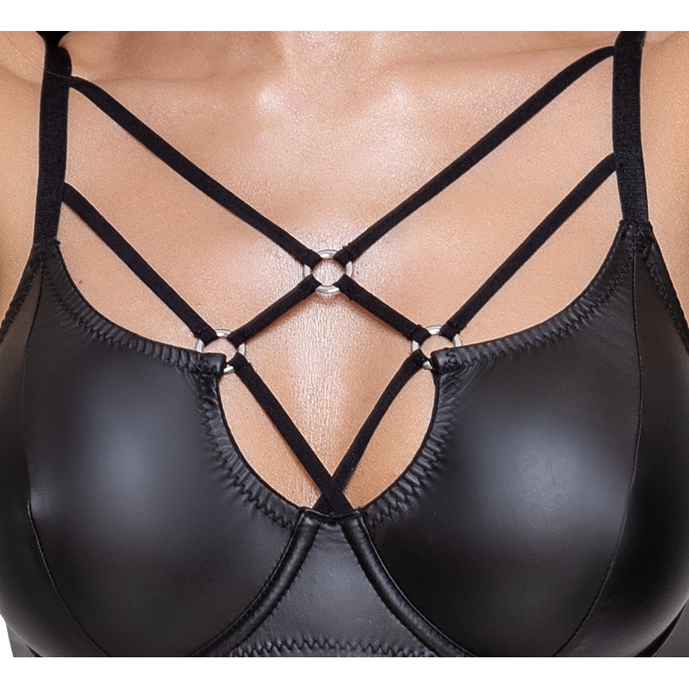 A bra with underwired cups and a Rio string in a set from Cottelli LINGERIE. Beautiful black matte look material with decorative stretchy straps and silver-coloured rings in the cleavage area and at the ...