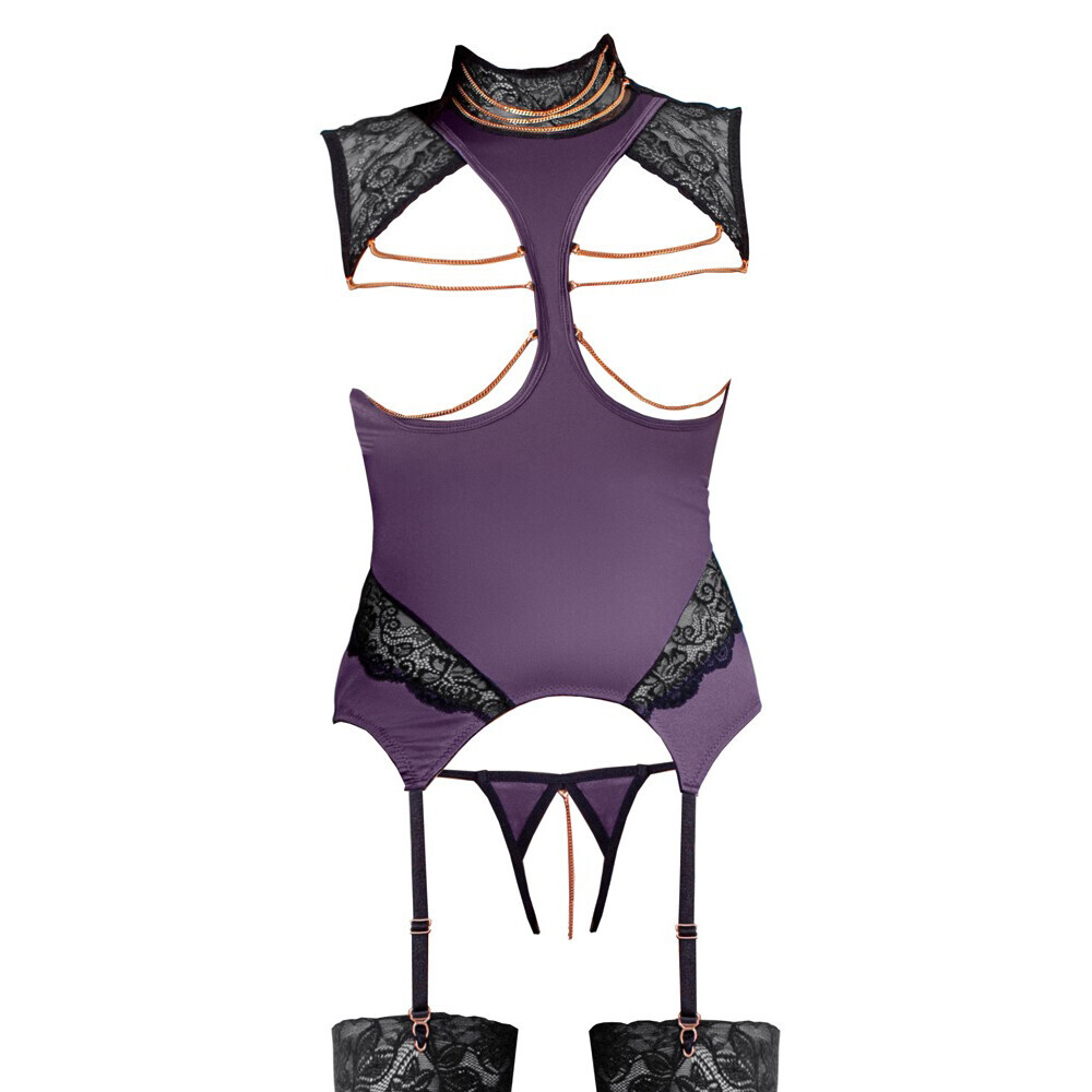 A provocative style in a beautiful mixture of materials with removable chains! Open cup and backless basque from Abierta Fina made out of stretchy purple satin with delicate lace inserts and a ...